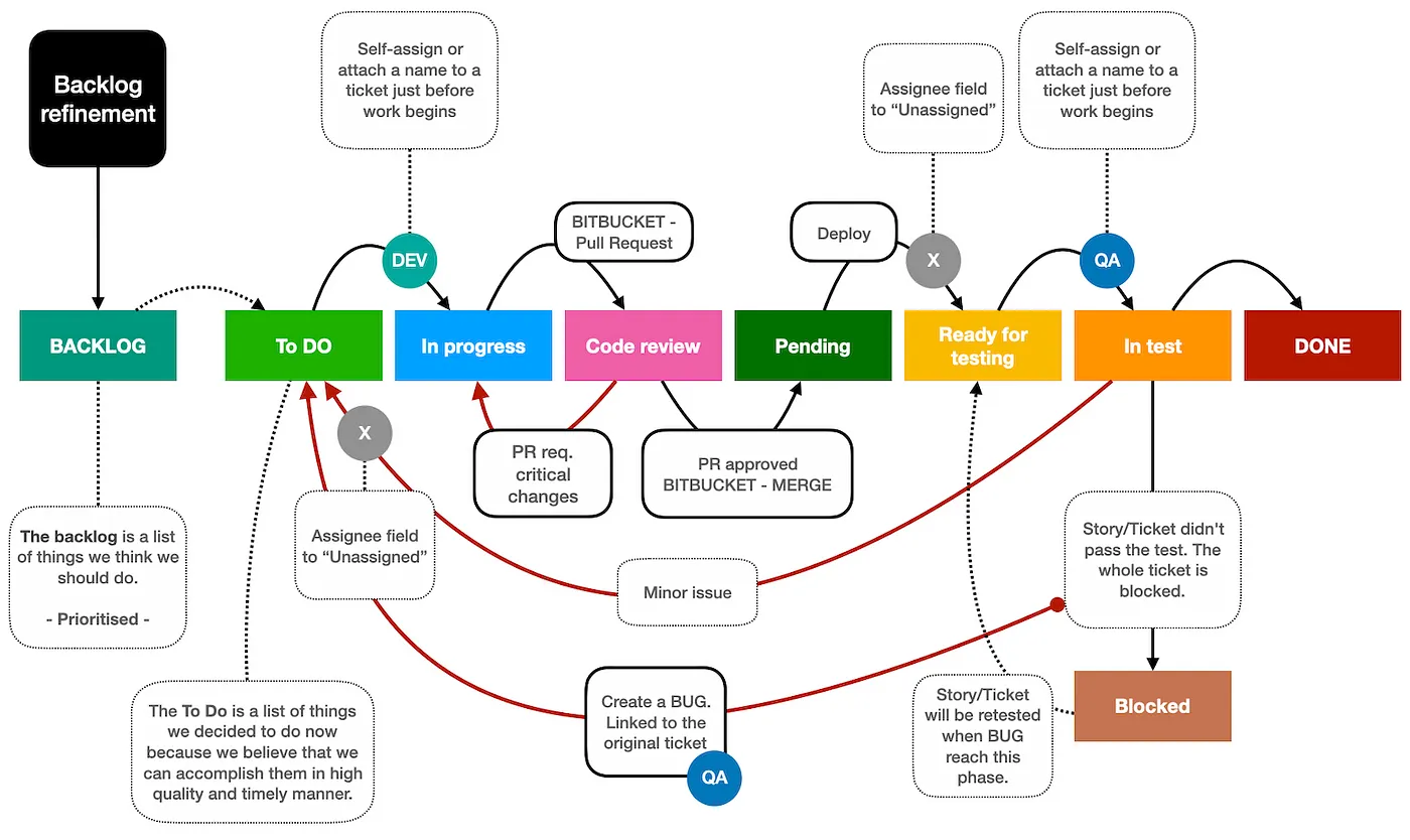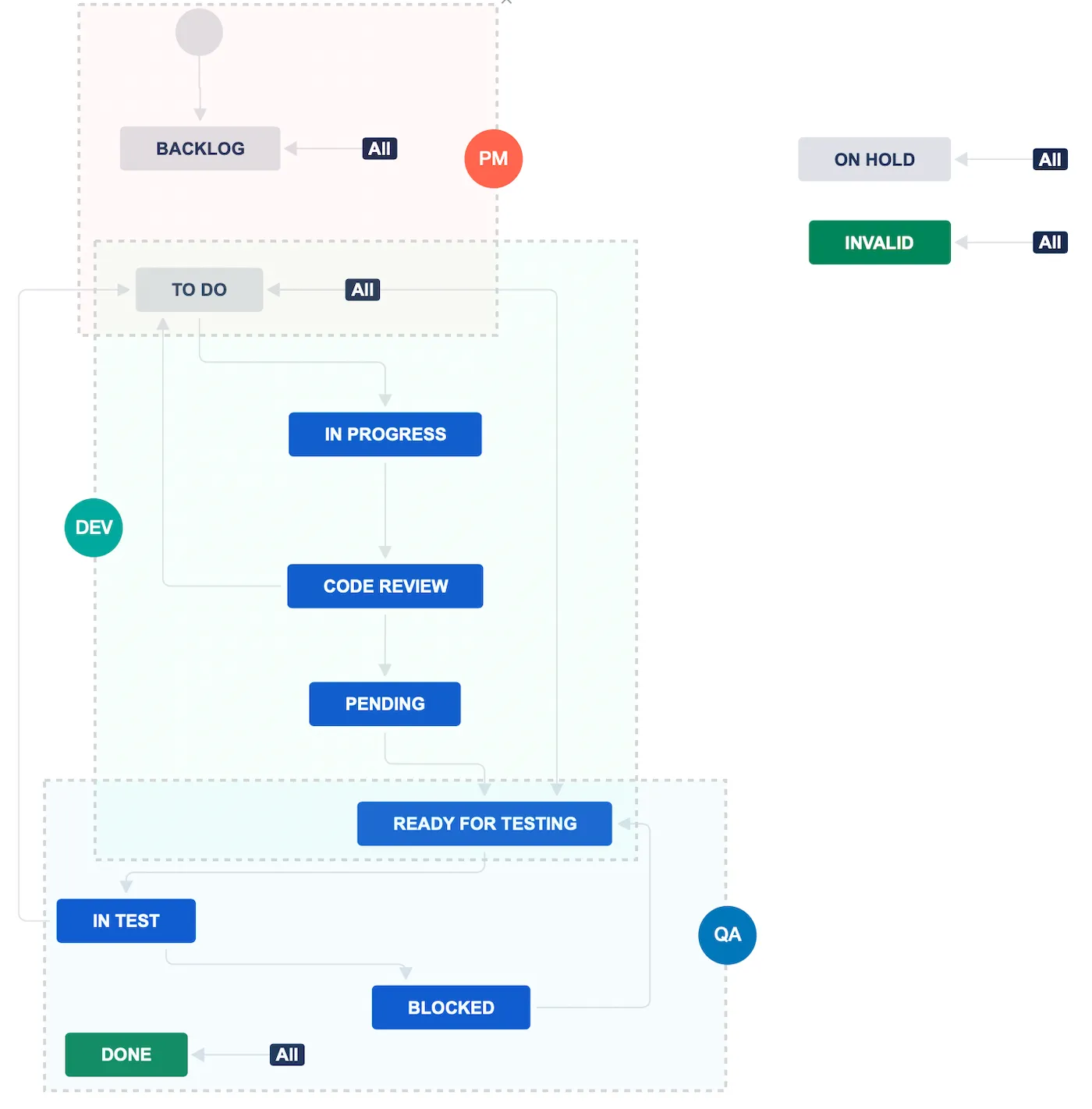 An additional element for the workflow itself is a well-defined responsibility map — different roles assigned to specific parts of the workflow. Just as context switching is dangerous during any work, role switching — juggling roles — is not advisable for a workflow. An example of such juggling could be when QA happens before Code Review (DEV)— but that’s a topic for another day.